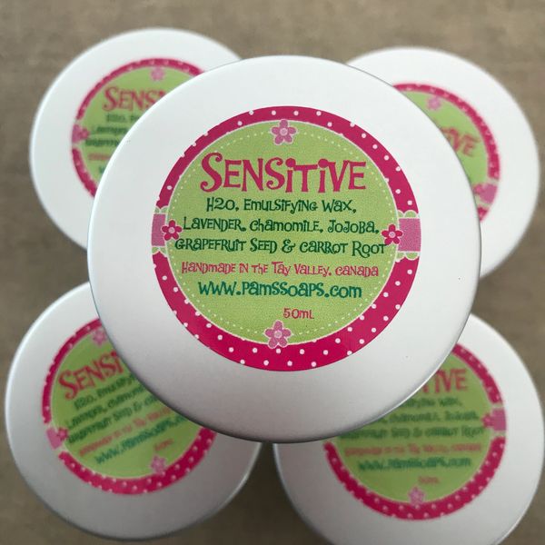 Sensitive Face Cream. Slightly scented with the oils of chamomile and lavender which soothes and protects your face. Chemical free 50ml